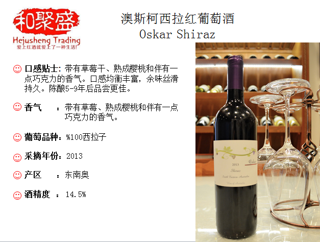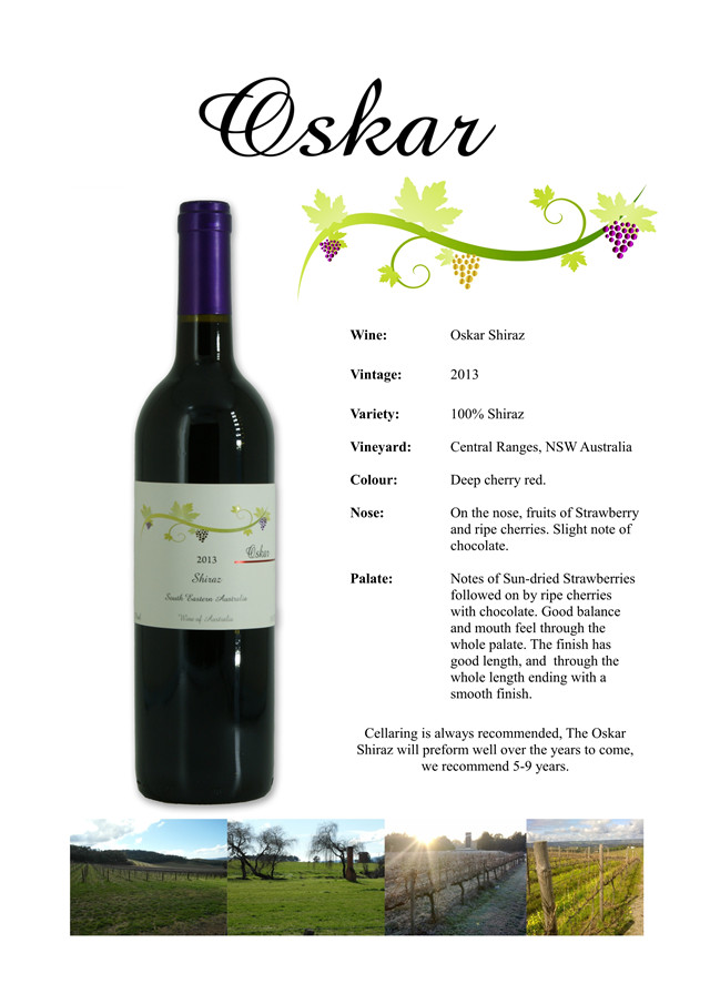 Oskar 系列是由澳大利亚中央区域的新南威尔斯洲那里的葡萄园酿制出来。中央区域拥有浓郁的土壤,是众所周知盛产优良品质葡萄的产区。加上庄园种植的葡萄树平均年纪有十到十五年,葡萄酒的产量跟质量有一定的保证。Oskar 系列组合了中央区域两至三个葡萄园的葡萄,有一些更是有机种植的葡萄园。 这个系列有西拉丶赤霞珠及长相思。