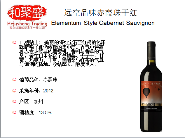 加州干红是一款适合不同场所饮用的酒款。它采用赤霞珠、西拉与美乐混酿的方式以便带来更好的结构与酒体。它果香丰富,单宁细滑。倒入杯中深红的酒色呈现迷人的光泽,轻轻晃动杯身便散发出如新鲜樱桃与李子的浓郁红色水果气息。香气与结构的融合了令口感更为怡人,摩卡咖啡般的单宁与大黄花的气息交融、加上了黑色覆盆子、樱桃和薄荷。收结干净悠长,充满黑醋栗与黑加仑的余香。此酒微微冰镇后饮用更佳,很适合与亲朋好友一起享用。